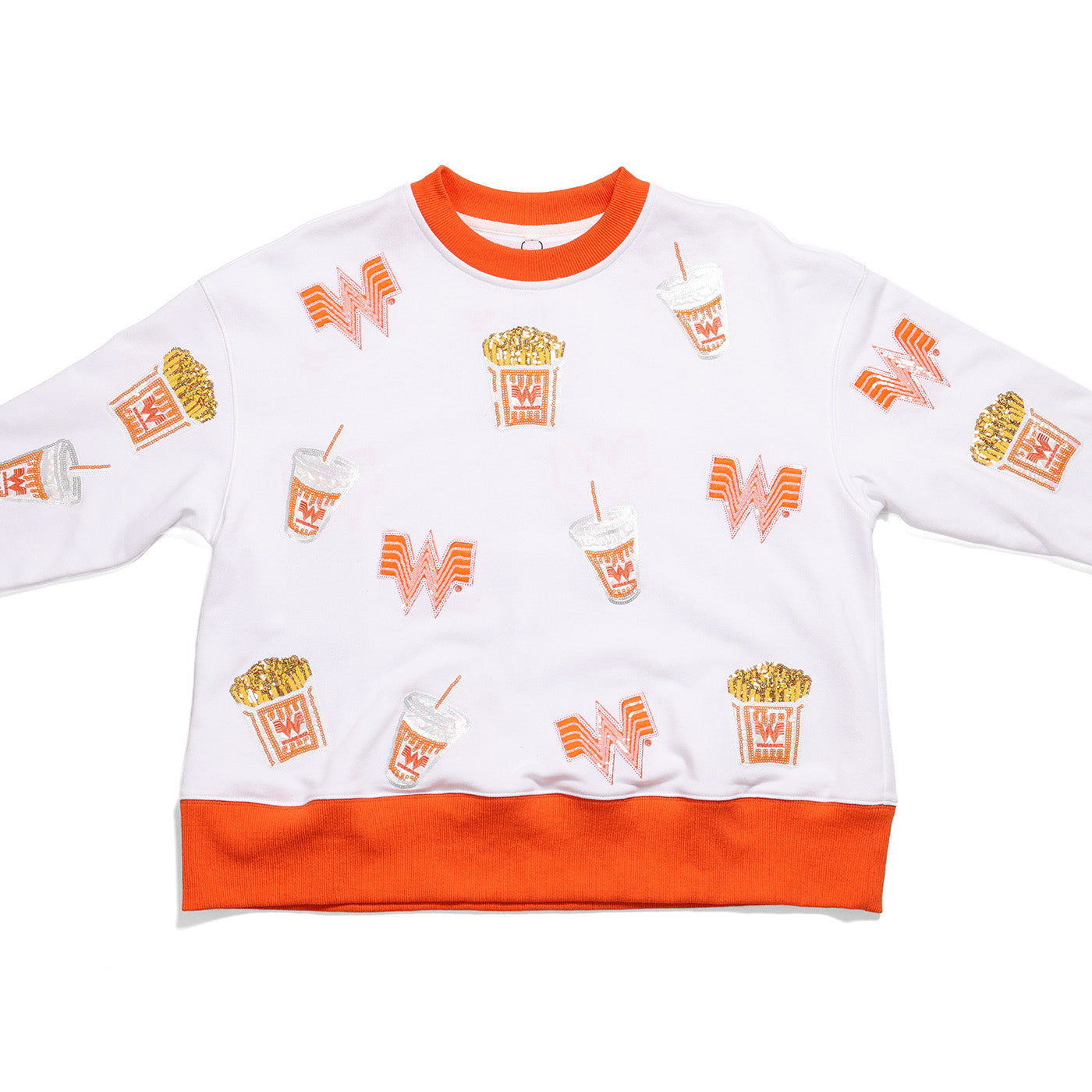Rock this exclusive Brianna Cannon collab sweatshirt and turn heads with its eye-catching design. The crisp white base pairs perfectly with vibrant orange ribbing, while sequined Whataburger icons dance across the front and back for that extra sparkle. It's the ultimate blend of comfort and personality.