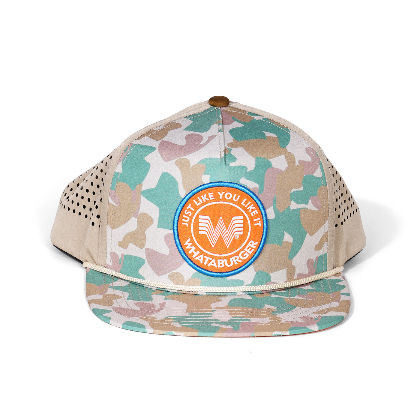 Rock the iconic Whataburger spirit with this Fall Camo Staunch Collection Hat. Featuring a tan base with camo front panel and bill, it's topped with an embroidered orange "Just Like You Like It" patch that's pure Whataburger pride. Tan rope detailing adds rugged texture, while the vibrant orange underbill gives it that signature pop. Perfect for fans who wear their Whataburger love loud and proud.
