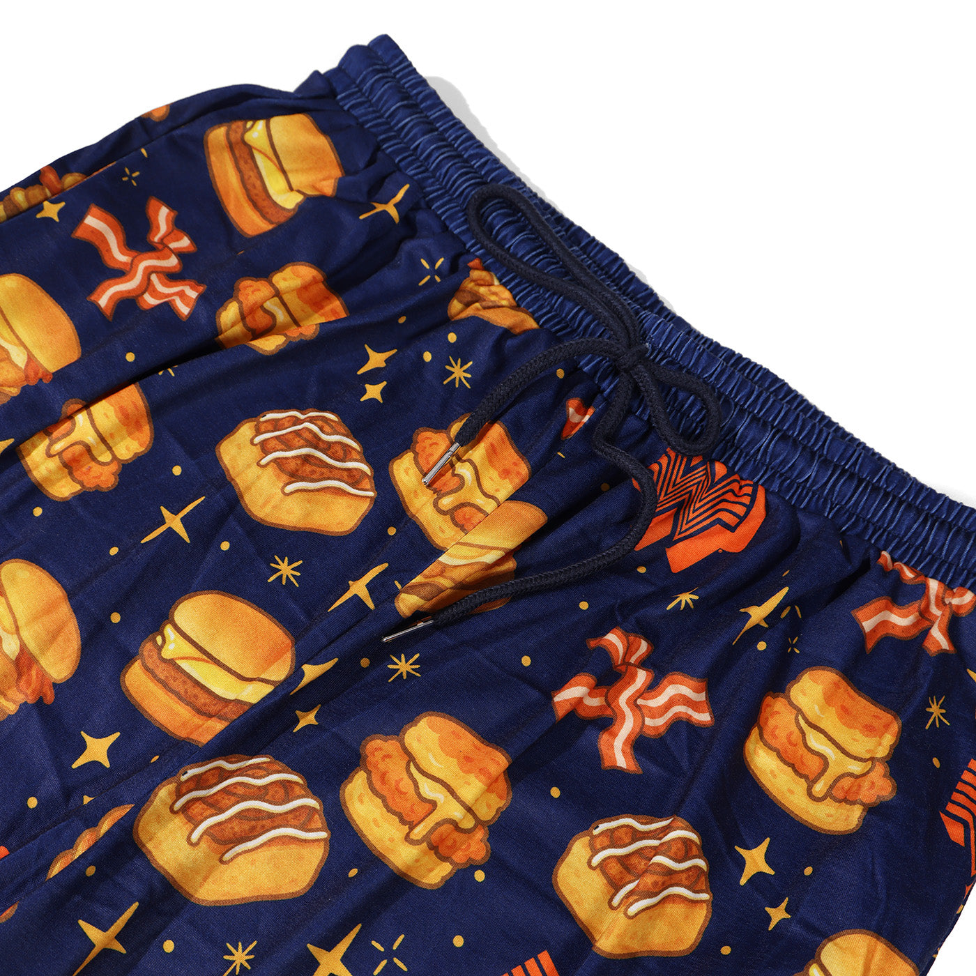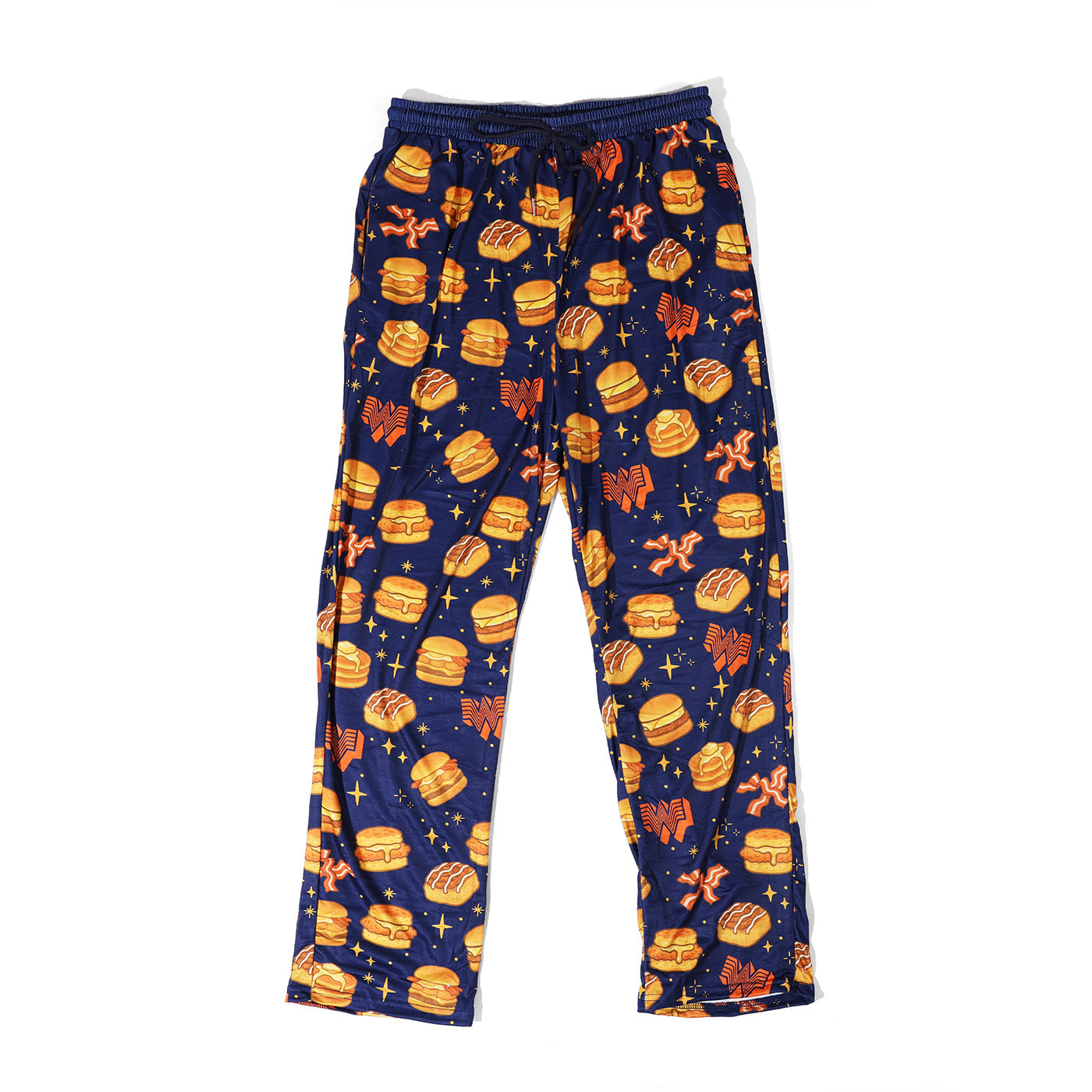 Cozy up in these navy blue pajama pants featuring all your favorite Whataburger breakfast cravings! These playful pants showcase iconic menu items including the Breakfast on a Bun, our legendary Breakfast Burger, the beloved Honey Butter Chicken Biscuit, and a delicious cinnamon roll. Perfect for breakfast lovers who want to wear their cravings to bed. Available in adult sizes, with youth sizes also in stock so the whole family can match!